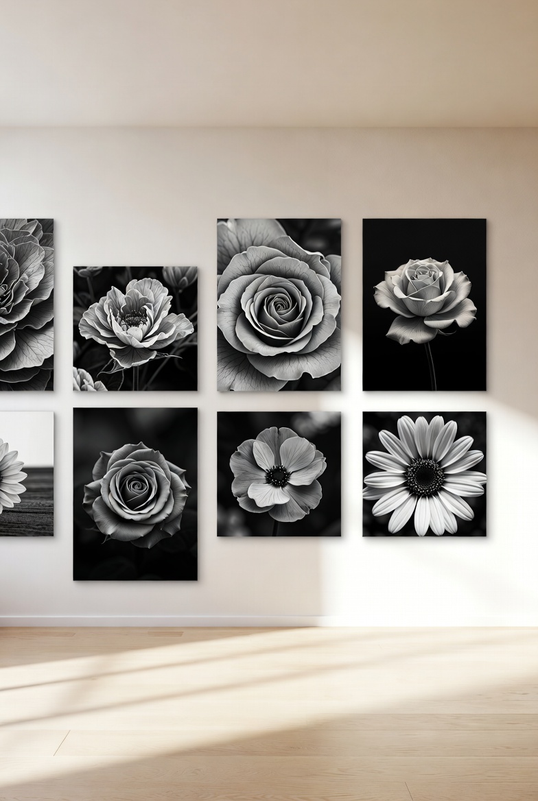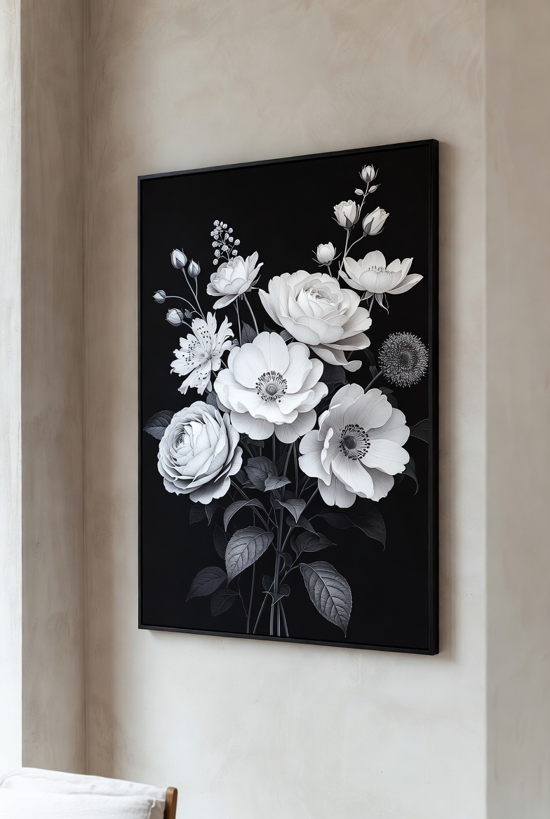 - Build a Gallery Wall: For a more eclectic and personal display, curate a gallery wall. Mix and match different sizes and styles of black and white flower prints. You can pair a detailed botanical illustration with a more abstract line drawing, or combine images of different flowers like peonies, poppies, and daisies. Using consistent frame colors, such as black, white, or natural wood, will create a cohesive and polished look.