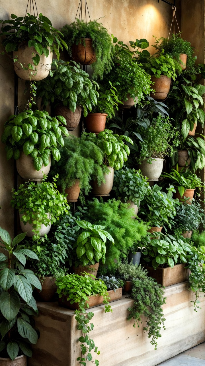 Suspend a wooden ladder horizontally or vertically from the ceiling or wall hooks. You can use S-hooks to hang small buckets or pots from the rungs. This creates an airy, floating effect that doesn’t feel as heavy as a solid wall of plants.