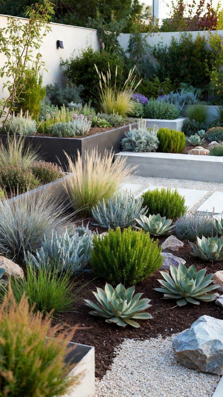 Grouping plants by height and texture creates visual interest while maintaining a neat, modern appearance. This approach supports sustainable and low-effort modern backyard landscaping.