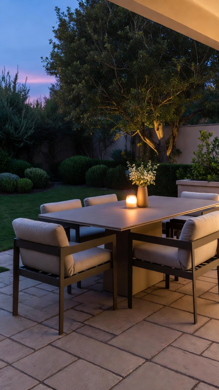 Use a sleek dining table, minimalist chairs, and weather-resistant materials. Position the dining area near the house or outdoor kitchen for convenience. Simple accessories like planters or pendant lights can elevate the space without clutter.